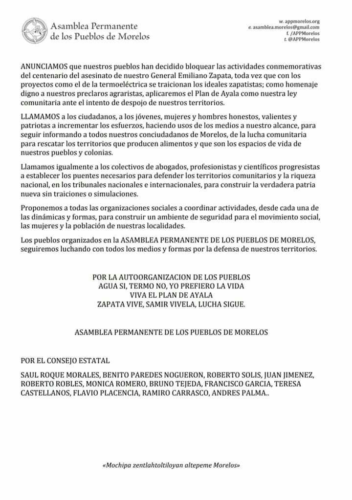 La Asamblea de los pueblos Permanentes por la Defensa del Agua y la tierra de Morelos Puebla y Tlaxcala, rechazan la pasada consulta del 23 y 24 de Febrero, es falsa e ilegal atenta contra la democracia de este gobierno asesino.