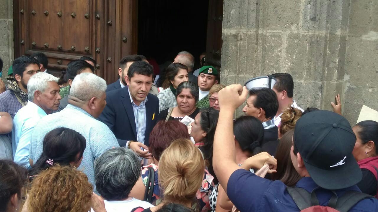 Algunos colectivos de familiares desaparecidos se quedaron fuera de este recinto a protestar y desplegar las mantas de los rostros donde denuncian la desaparición de sus hijas, hijos, esposos y familiares.