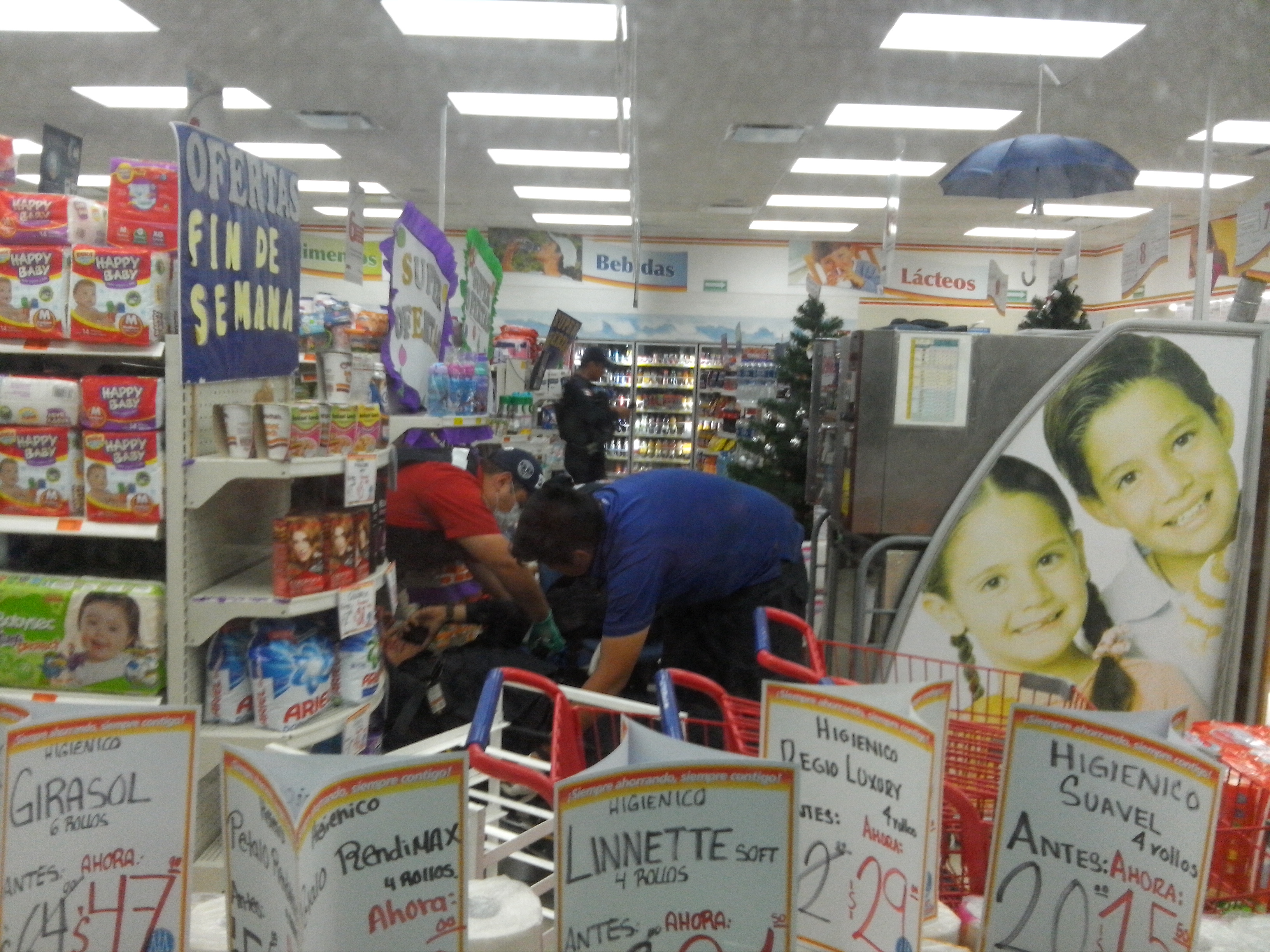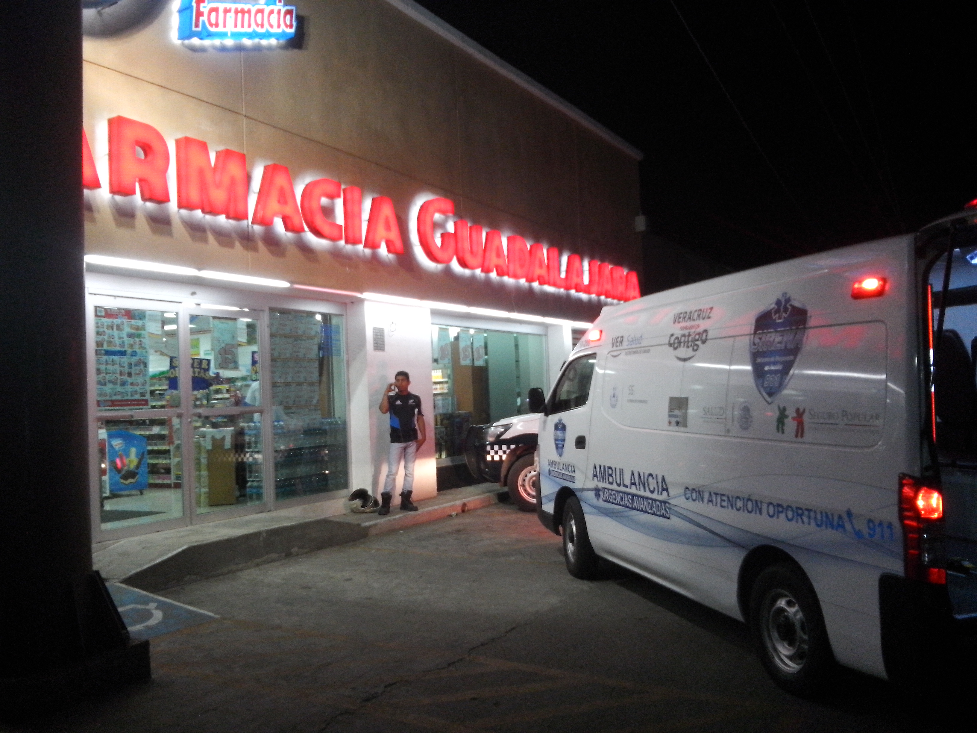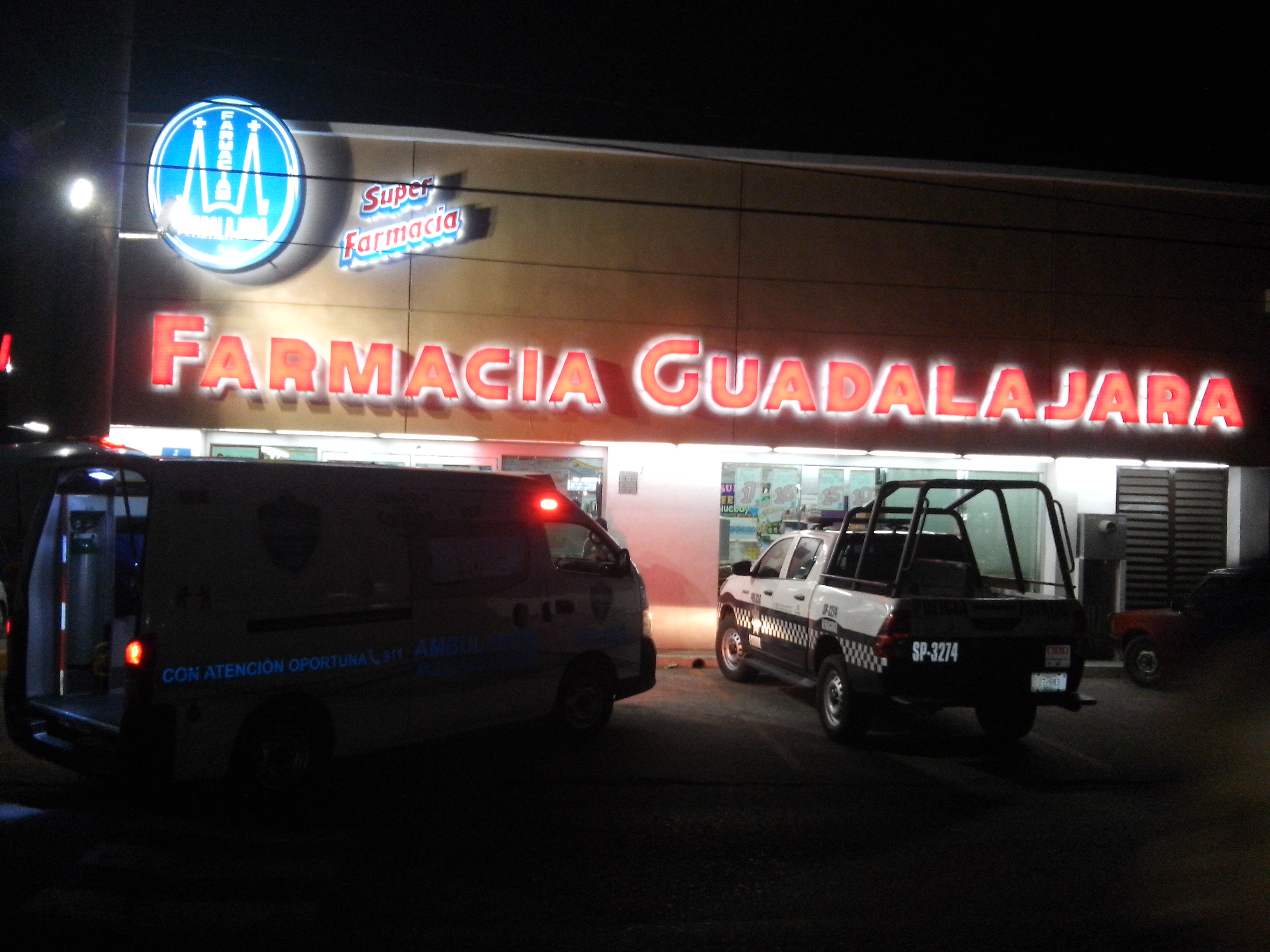 La noche este lunes, la Farmacia Guadalajara, en El Tejar. Reportan un guardia de seguridad lesionado. Al lugar llegar elementos de la Polícia Estatal y de Protección Civil.