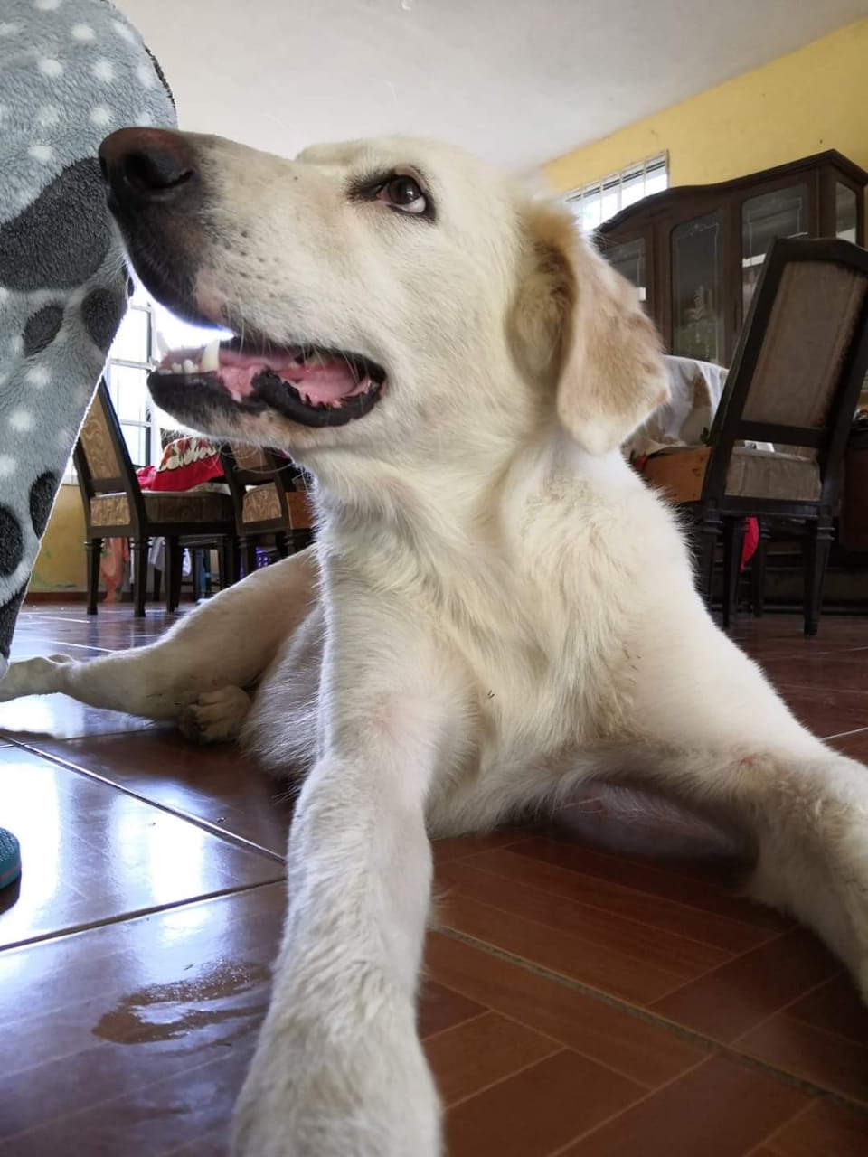 Marley es de color beige blanco, con pelo negro cerca de los ojos y de hocico largo.