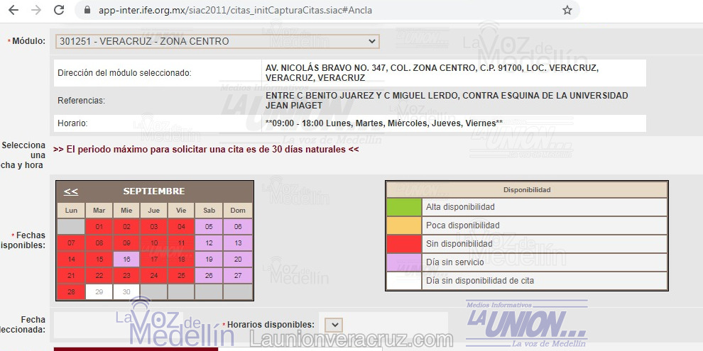 En la ciudad y puerto de Veracruz hay cuatro módulos de atención uno en el Fraccionamiento Laguna Del Valle, sobre la avenida J. B Lobos; otro en la zona centro en la avenida Nicolás Bravo; el tercero en la colonia Ignacio Zaragoza, sobre al avenida la Fragua; y el cuarto con la zona norte, sobre la avenida Fidel Velázquez; de todos ellos al consultar en la plataforma www.ine.mx no hay disponibilidad para el mes de septiembre y tampoco muestra opciones para poder realizar citas en otro mes.