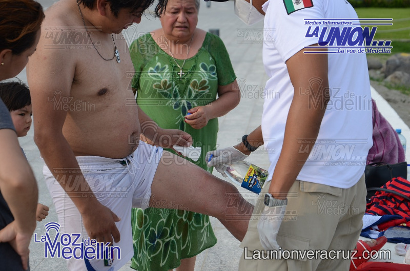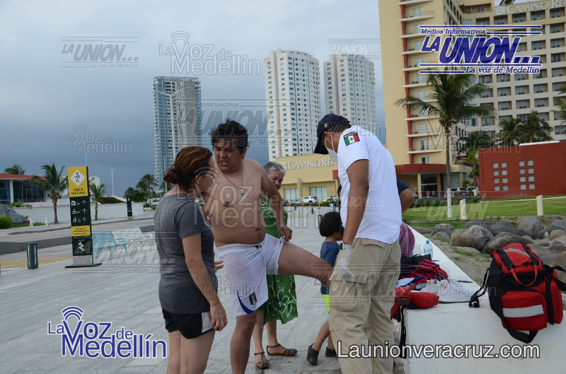 Un turista que acudió junto a su familia a refrescarse a la playa detrás del Hotel Camino Real en la colonia Costa de Oro, sufrió la picadura de una medusa y tuvo que ser atendido por brigadistas.