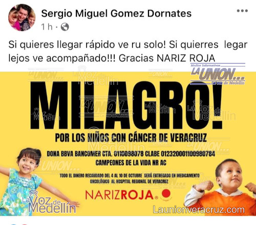 «Quiero agradecer a Nariz Roja y al doctor Sergio Gallegos Castorena que nos están echando la mano para conseguir medicamentos de quimioterapia y que hayan hecho la campaña ‘Un Milagro para Veracruz'», manifestó Gómez Dorantes.