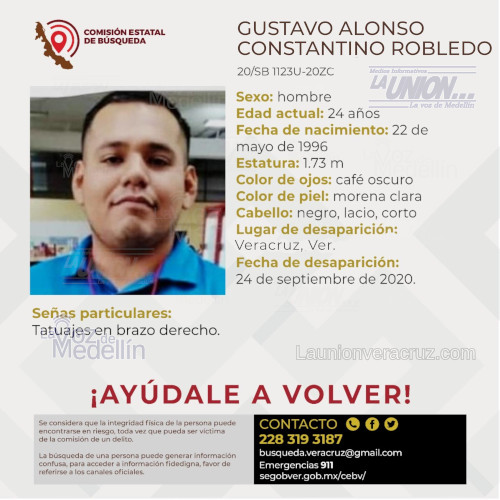 Solicitan la colaboración para localizar a Gustavo Alonso Constantino Robledo, cualquier información contactar al número y/o correo que aparecen al margen de este boletín.