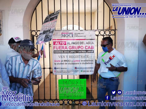 El Movimiento Civil Independiente (MOCI) se manifestó en la cabecera municipal de Boca del Río, acusando a la empresa privada que administra Compañia del Agua de Boca del Río (CAB) de no entregar agua potable y fallar así a la disposición de la COFEPRIS y Secretaría de Salud.