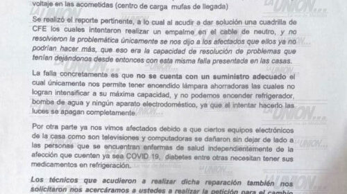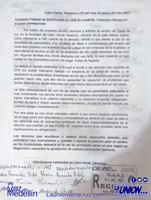 Vecinos de la localidad Cabo Verde Veracruz desde el 26 de diciembre de 2020 tienen problemas con el servicio eléctrico, por lo que entregaron un oficio a Comisión Federal d Electricidad (CFE) para que atienda el problema que lleva más de tres semanas.