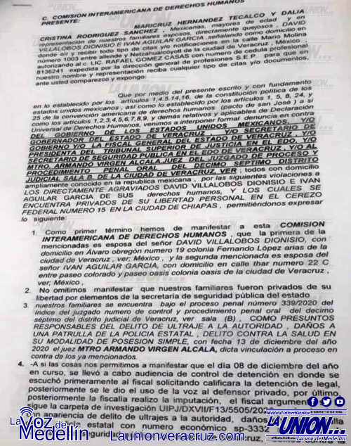Maricruz Hernández Tecalco, esposa de David Villalobos Dionisio y Dalia Cristina Rodríguez Sánchez, esposa de Iván Aguilar García, respaldadas y representadas jurídicamente por el Maestro en Derecho e integrante del Colegio de Abogados de la República Mexicana, A.C, Rafael Gómez Casas, entregarán el documento ante esta instancia, solicitando la pronta intervención en favor de los ahora detenidos.