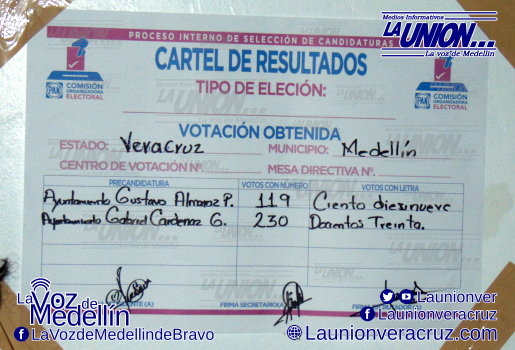 Los resultados finales del conteo de la votación de los precandidatos a la Presidencia Municipal por el PAN en Medellín de Bravo fueron: