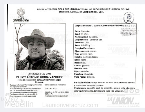 La Comisión Estatal de Búsqueda emitió un boletín para localizar al C. Elliot Antonio Coria Vázquez, quien desapareció este viernes 19 de febrero en Plan de Manantial, Paso de Ovejas.