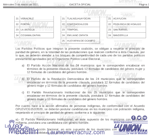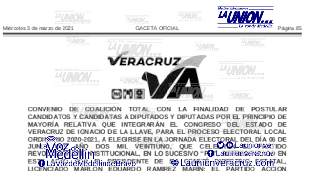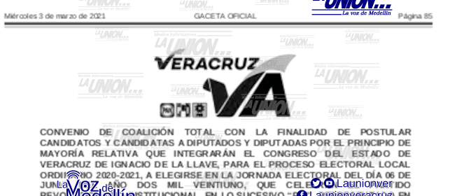 El pasado 3 de marzo, se publicó en la Gaceta Oficial del Estado de Veracruz el acuerdo OPLEV/CG058/2021 del Consejo General, que determina la procedencia de la solicitud de registro del convenio de coalición total, para postular los cargos a Diputaciones Locales por el principio de mayoría relativa y; el convenio de coalición flexible, para postular los cargos de Presidencias Municipales y Sindicaturas en los municipios del Estado de Veracruz, presentados por los partidos políticos: Acción Nacional (PAN), Revolucionario Institucional (PRI) y de la Revolución Democrática (PRD), bajo la denominación «Veracruz Va», para el proceso electoral local ordinario 2020-2021.