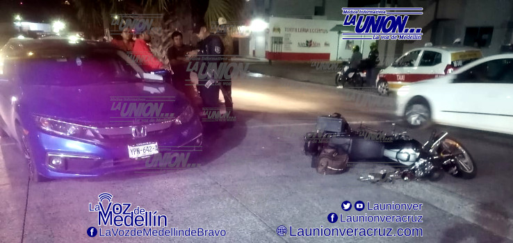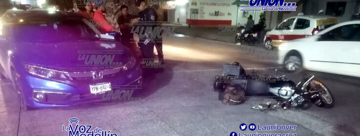 El conductor de una motocicleta intentó rebasar por la izquierda pero no se percató que el vehículo Honda daría vuelta en U y terminó chocando.