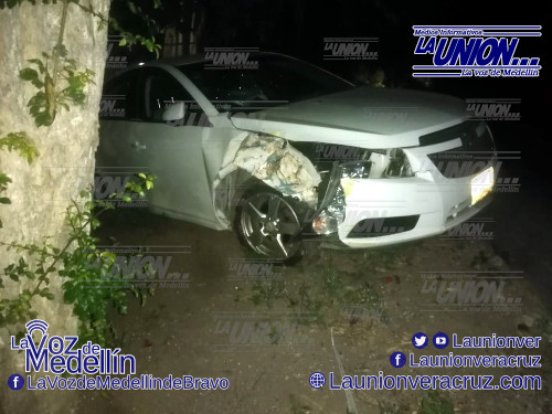 El conductor de un vehículo Chevrolet Cruze perdió el control de su vehículo al conducir a exceso de velocidad sobre una curva, provocando que la unidad se saliera de la carpeta asfáltica y se estrellara contra un árbol.