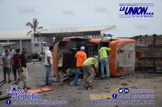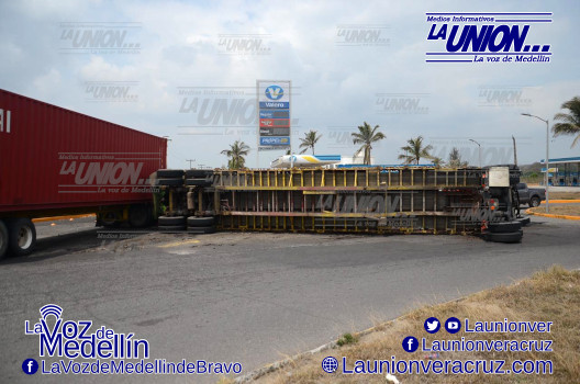El conductor de un tráiler que tuvo una falla mecánica, maniobró con mucha pericia para evitar ocasionar un accidente de mayores dimensiones a un costado de la autopista Veracruz-Cardel donde volcó.