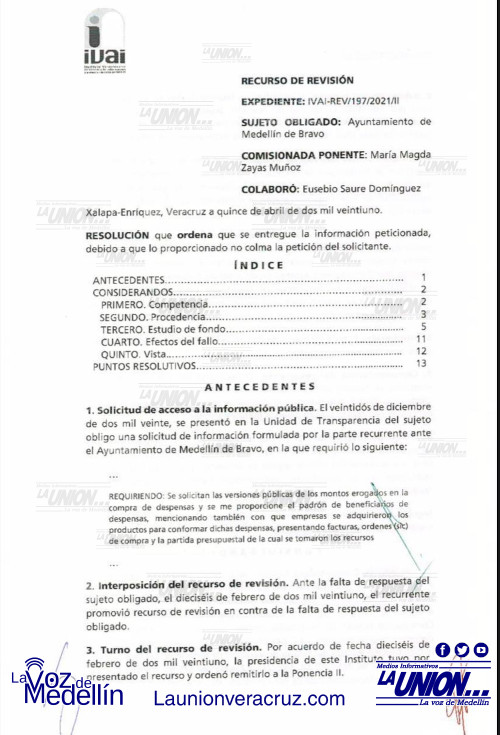 En el expediente IVAI-REV/197/2021/II, con fecha del 15 de abril, se indica que a partir de la fecha de notificación, realizada el 19 de abril, se le da un plazo al municipio, no mayor a tres días hábiles, para que el Ayuntamiento de Medellín dé a conocer el monto erogado en la compra de despensas, el número de beneficiarios, el nombre de empresas a las que les fueron adquiridos los productos para las despensas, presentación de facturas, órdenes de compra y la partida presupuestal de dónde se tomaron los recursos.