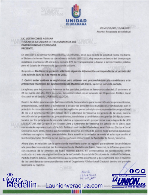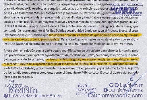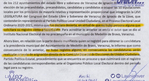 Mediante oficio fechado al 15 de abril, el partido político Unidad ciudadana informó que después de que se emitió la convocatoria para el registro de aspirantes a la Presidencia municipal de Medellín y a Diputado local del distrito 17 Medellín, fue declara desierta al no haber persona alguna que se registrara.