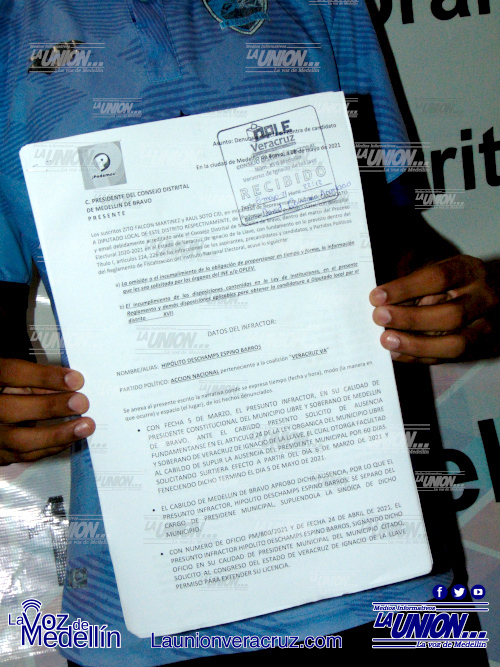El pasado sábado, Zito Falcón Martínez, representante distrital del partido Podemos; y Raúl Soto Cid, candidato a diputado local por el distrito XVII Medellín por el mismo partido, realizaron una denuncia ante el OPLE por presuntos delitos electorales cometidos por Hipólito Deschamps Espino Barros, candidato a diputado por el mismo distrito por la coalición Va por México conformada por los partidos PRI-PAN-PRD.