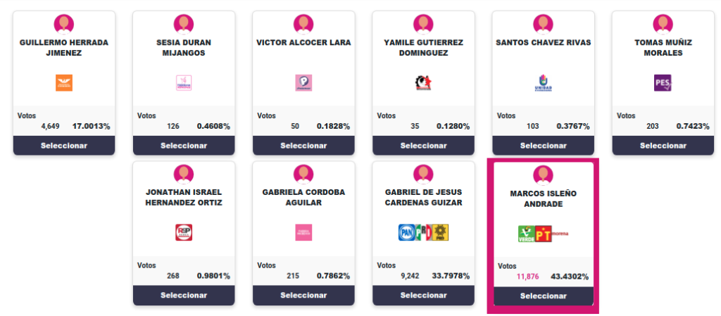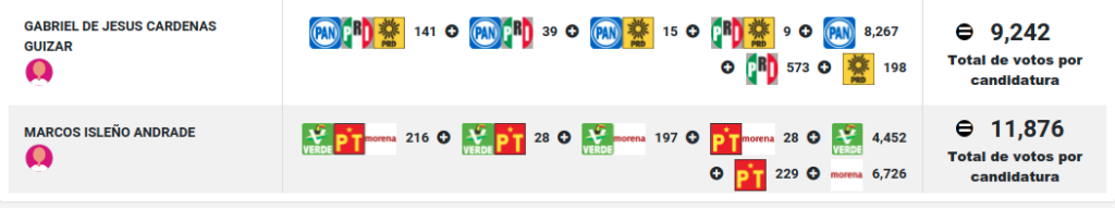 - 11,876 votos MARCOS ISLEÑO ANDRADE (MORENA-PVEM-PT).
