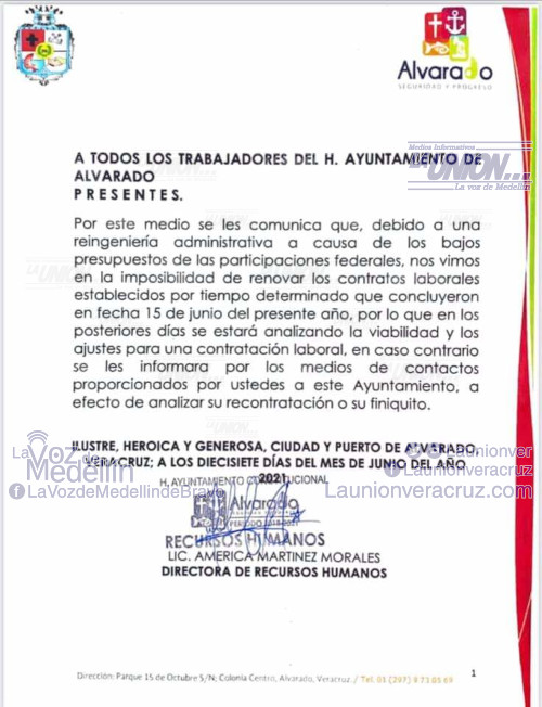Aproximadamente 500 trabajadores del Ayuntamiento de Alvarado fueron dados de baja a partir del pasado martes 15 de junio, bajo el argumento de problemas económicos, señalan en redes sociales.