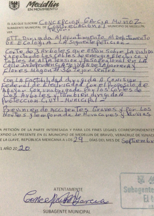 En un escrito que presentado el 20 de septiembre del año pasado, la sub agente municipal hace la petición formal al ayuntamiento para que atienda el problema antes de que algún norte fuerte derribara el árbol, ya que podría resultar una desgracia.