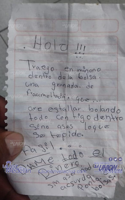 “Hola, traego en mi mano dentro de la bolsa una granada de fraccmettacion que are estallar bolando todo contigo dentro sino ases lo que se te pide. Fasil, dame todo el dinero sin aser nada acsurdo. Ponlo en bolsas”, decía el mensaje con faltas de ortografía en una hoja de libreta.