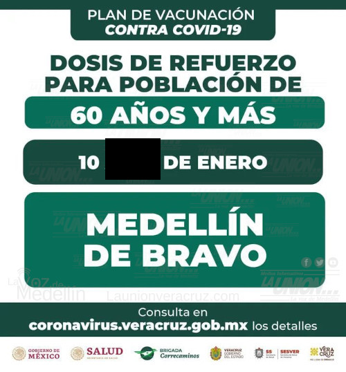 Cabe mencionar que se generó una confusión tras la circulación del boletín de una nueva jornada para este refuerzo, ya que se acaba de aplicar en Medellín hace unos días; finalmente se confirmó que derivado de esto, se instalará el modulo de vacunación mañana en el centro de salud de El Tejar; el boletín original planteaba que la jornada sería del 10 al 13, pero hasta el momento sólo se ha confirmaddo la fecha del 10 de enero.