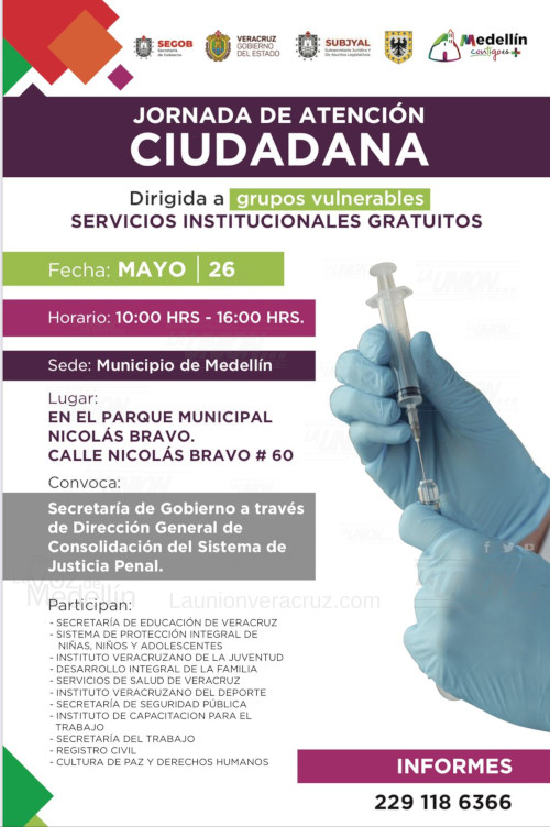 Con la finalidad de atender de forma directa las necesidades de los grupos vulnerables, el Gobierno del Estado, en coordinación con el ayuntamiento de Medellín, llevará a cabo la Jornada de Atención Ciudadana, en donde se ofrecerán servicios institucionales gratuitos.