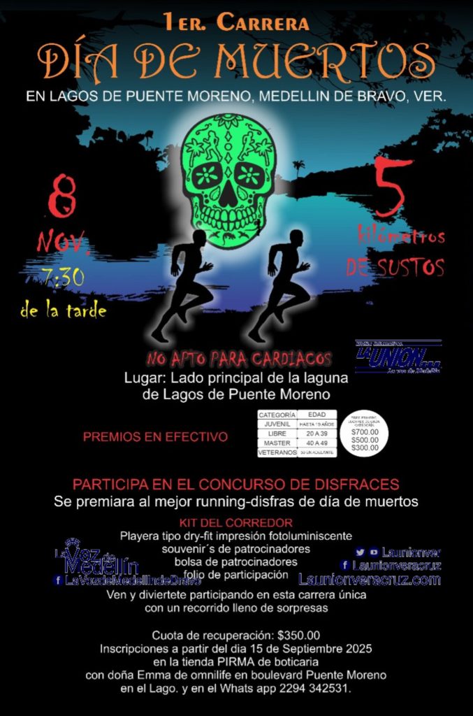 El próximo sábado 8 de noviembre se realizará la Primer Gran Carrera del Día de Muertos en el fraccionamiento Lagos de Puente Moreno, en la cual también habrá concurso de disfraces en un evento familiar.