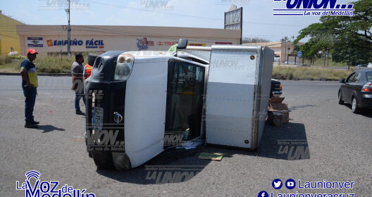 Cerca del mediodía de este viernes, una camioneta que transportaba diversos productos de limpieza e higiene personal, sufrió una volcadura luego de haber sido impactada por un autobús del servicio urbano.