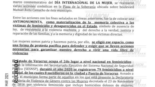 Las jovenes que colocaron el Antimonumenta el pasado lunes en la Plaza de la Soberanía, enviaron un documento al alcalde de Veracruz, Fernando Yunes Márquez, para dialogar sobre el cambio de sede de la edificación.