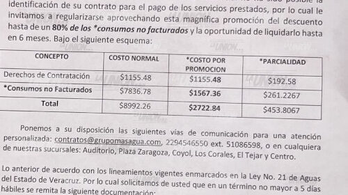 A unos meses de que termine la administración de Hipólito Deschamps Espino Barros, presidente municipal de Medellín de Bravo, vecinos de la Col. 20 de noviembre señalaron que Grupo MAS quier hacer un cobro de casi tres mil pesos para realizar el contrato del servicio de agua potable, pero que la empresa no suministrando agua potable, por lo que algunos de ello manifestaron que realizaran acciones legales en contra ayuntamiento y Grupo MAS.