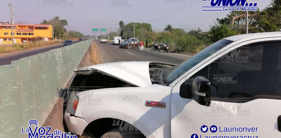 Este martes 13, se registro un fuerte accidente en la carretera federal 180 en el que participaron vehículos del convoy del precandidato a la presidencia municipal de Medellín por el partido Movimiento Ciudadano. El transito estuvo detenido por varios minutos hasta que fueron retirados los vehículos. Al lugar llegaron elementos de la Guardia Nacional.