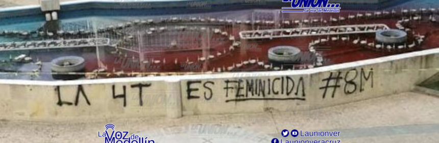 La fuente que se ubica en el parque Reforma al centro de la ciudad de Tuxpan, amaneció teñida de color rojo y con un mensaje en un costado «La 4T es feminicida #8M».